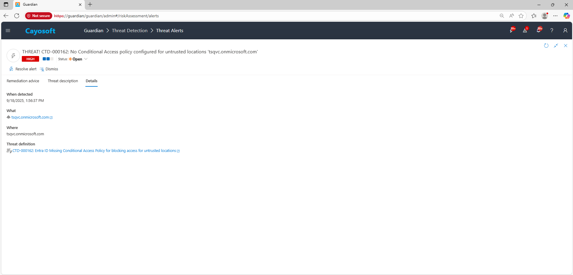 2.) Open All Alerts and search for CTD-000162 or Entra ID Missing Conditional Access Policy for blocking access for untrusted locations.