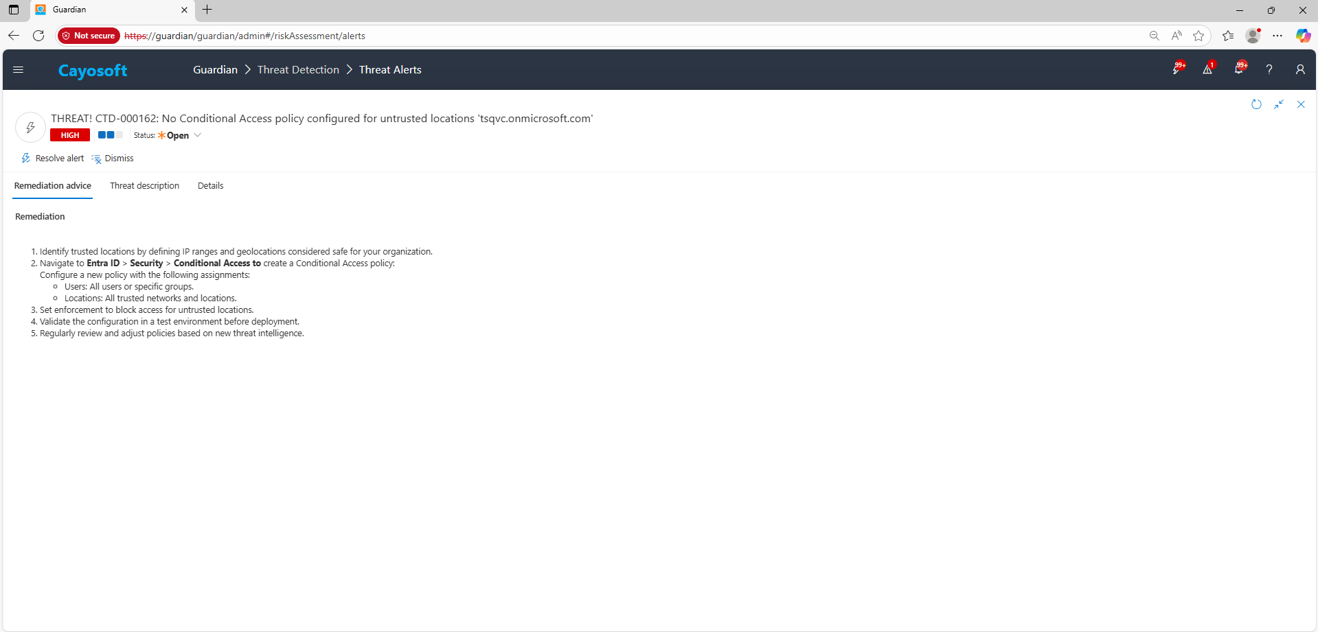 Cayosoft Guardian can proactively detect and alert on missing Conditional Access policies for untrusted locations. It continuously monitors Active Directory, Entra ID, Microsoft 365, and Intune for over 200 misconfigurations, providing early warning before attackers can exploit them.