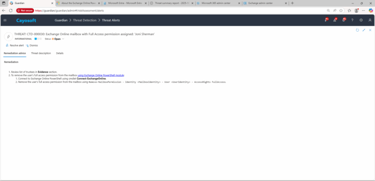 Cayosoft Guardian can proactively detect and alert on Exchange Online mailbox with Full Access permission assigned. It continuously monitors Active Directory, Entra ID, Microsoft 365, and Intune for over 200 misconfigurations, providing early warning before attackers can exploit them.