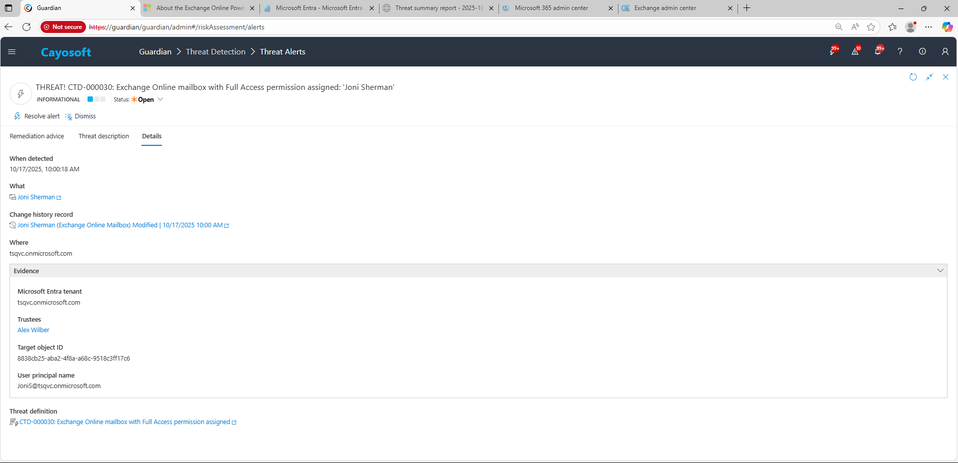 In the Cayosoft Guardian Threat Detection Dashboard, search for CTD-000030 or the issue name. The alert provides the mailbox’s trustees, target object ID, and user principal names, enabling administrators to quickly identify unapproved Full Access assignments for remediation.