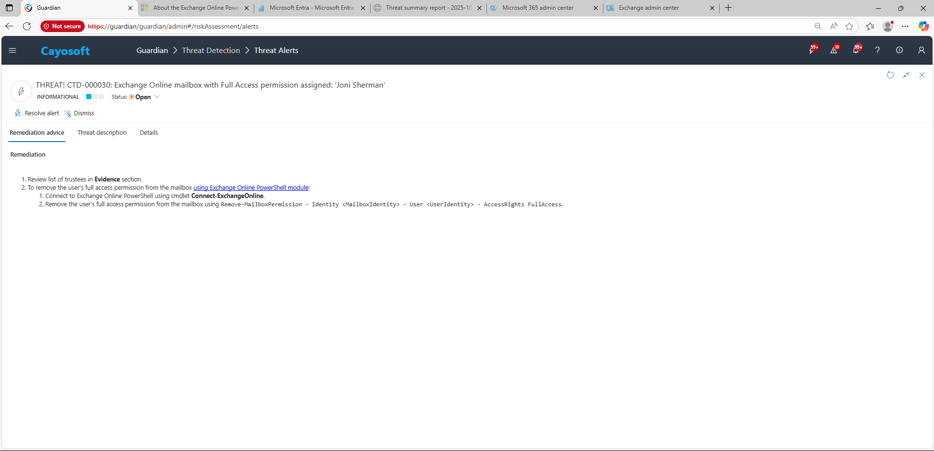 Cayosoft Guardian can proactively detect and alert on Exchange Online mailbox with Full Access permission assigned. It continuously monitors Active Directory, Entra ID, Microsoft 365, and Intune for over 200 misconfigurations, providing early warning before attackers can exploit them.
