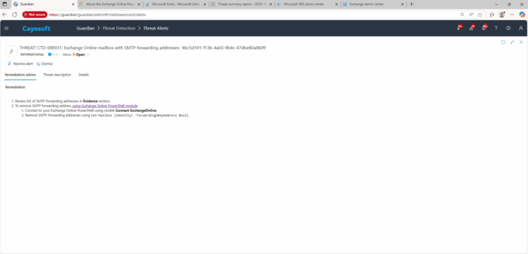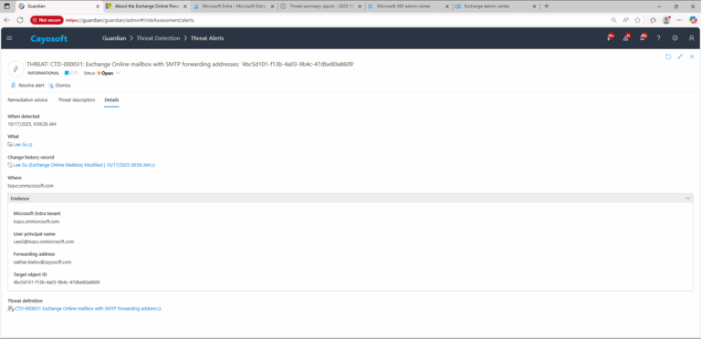In the Cayosoft Guardian Threat Detection Dashboard, search for CTD-000031 or the issue name. Alerts provide the mailbox’s user principal name, the destination forwarding address, and the target object ID, allowing rapid verification and remediation.