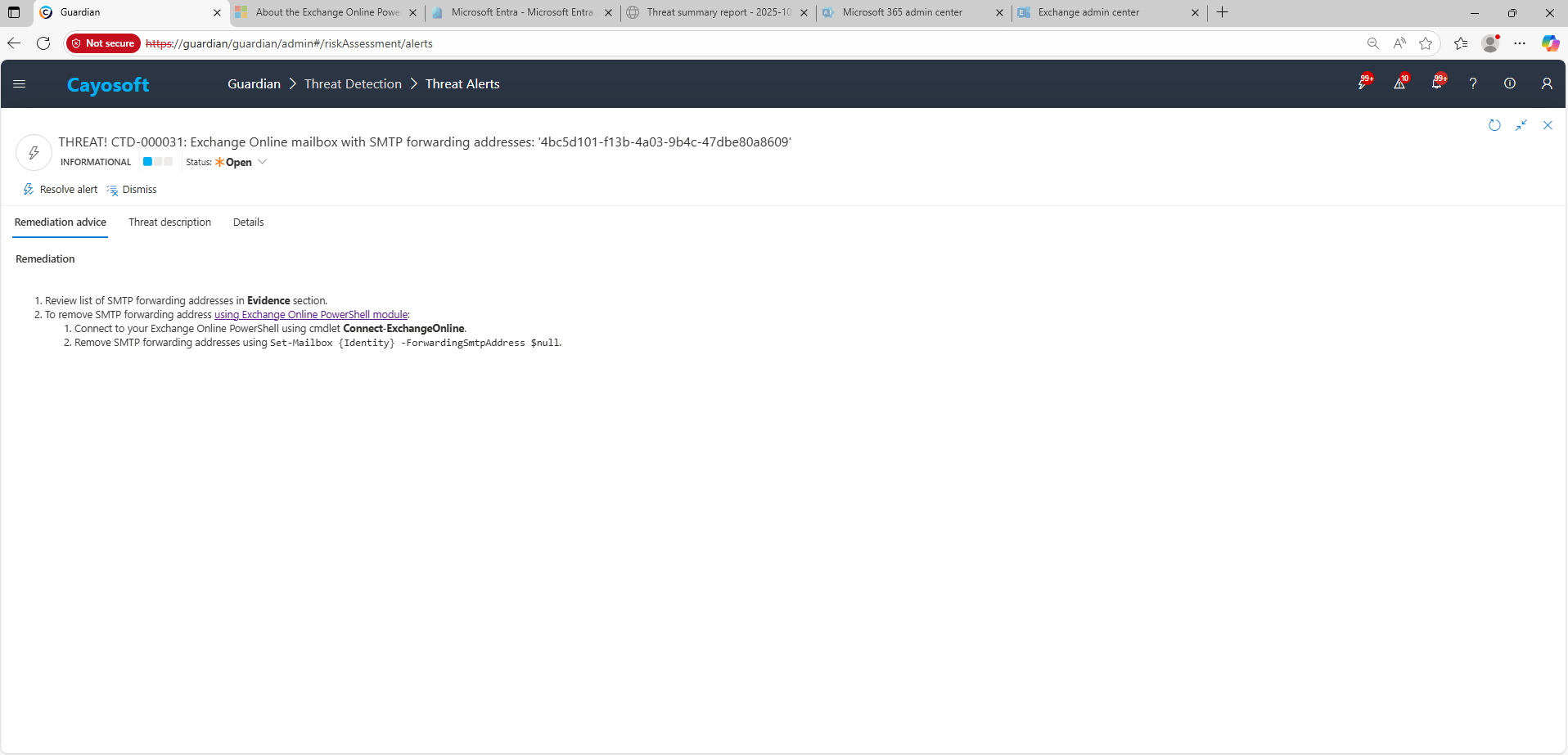 In the Cayosoft Guardian Threat Detection Dashboard, search for CTD-000031 or the issue name. Alerts provide the mailbox’s user principal name, the destination forwarding address, and the target object ID, allowing rapid verification and remediation.