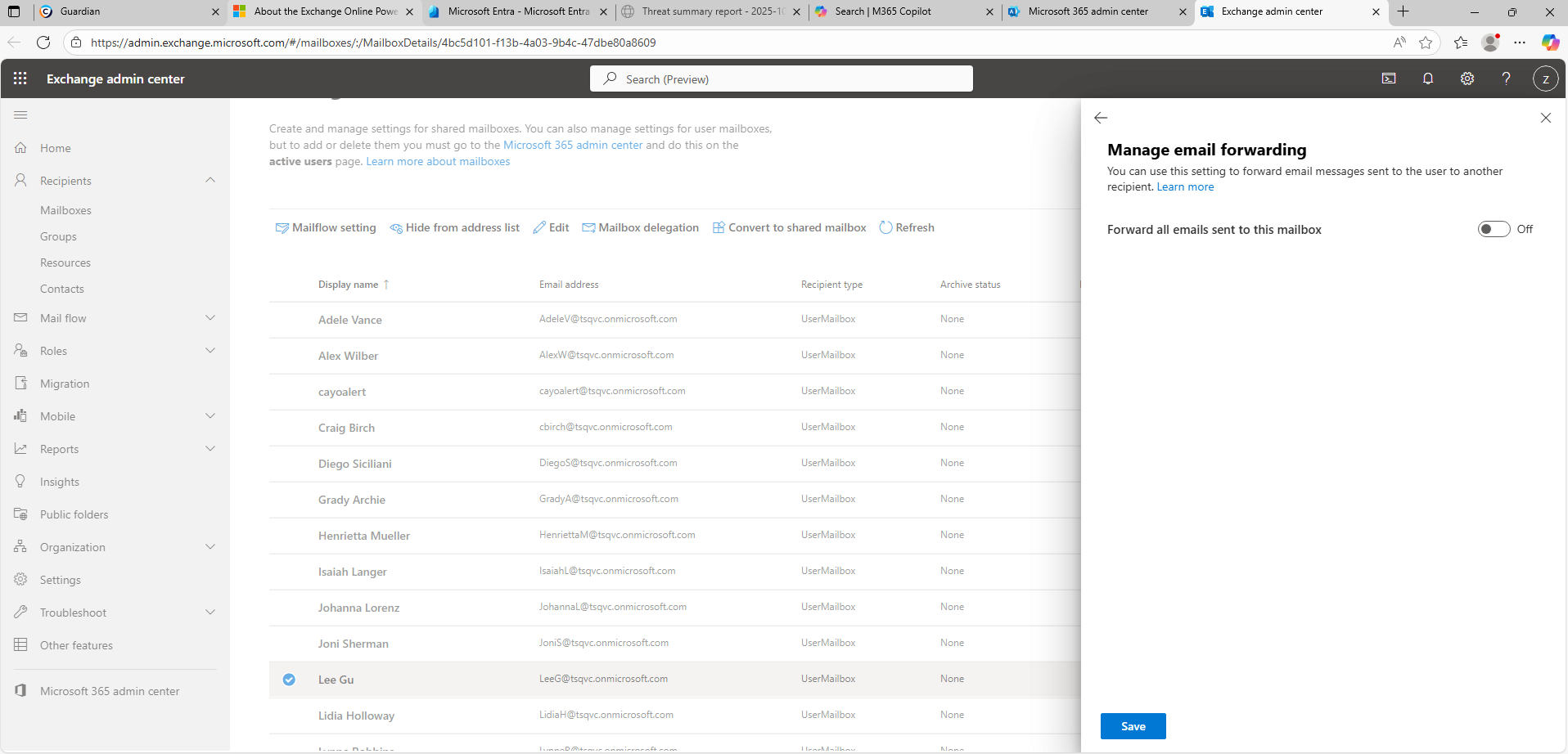 An Exchange Online mailbox configured with an SMTP forwarding address can enable covert data exfiltration and long-term access. Attackers commonly add external forwarding to siphon sensitive email without triggering obvious sign-in alerts.