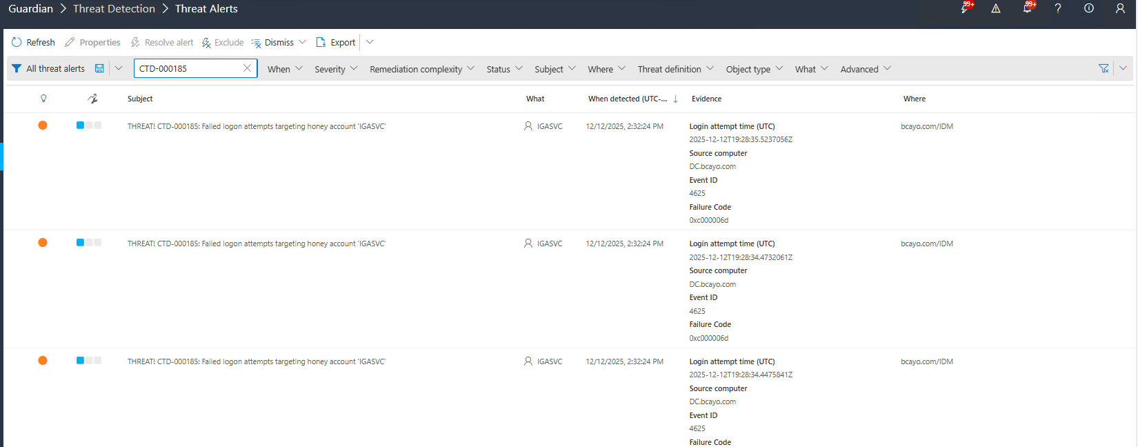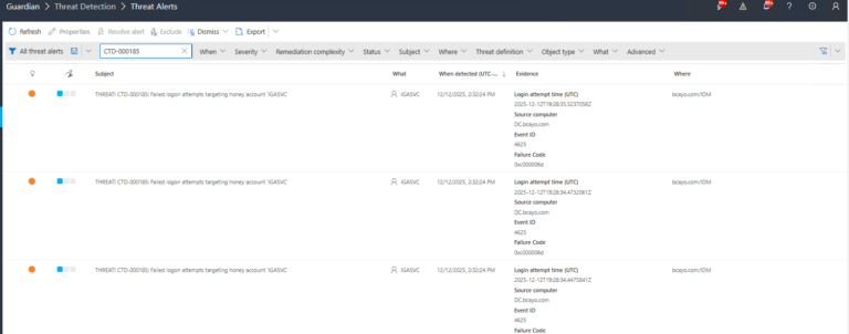 - Maintain and review Cayosoft Guardian alerts for CTD-000185 regularly, tuning honey account names and the lookback window to align with your environment and threat model.