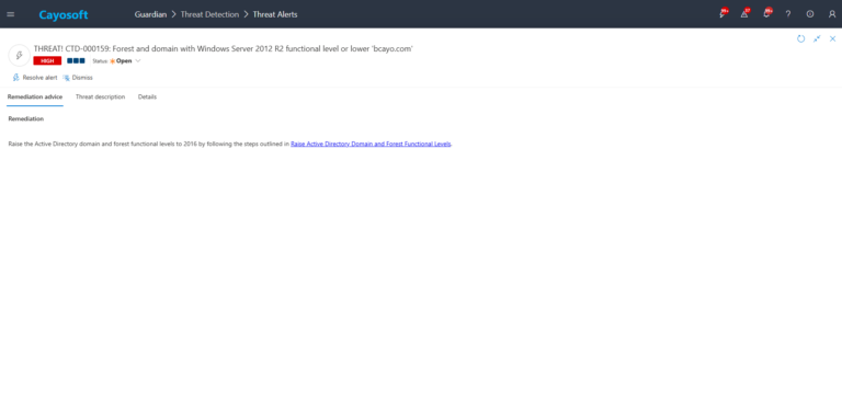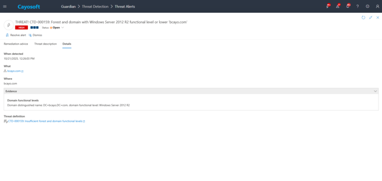 Yes. Cayosoft Guardian delivers continuous monitoring, real-time alerts, and prescriptive remediation guidance for CTD-000159 and more than 200 other AD/Entra/M365 risk conditions. It automatically surfaces outdated functional levels and ensures environments meet modern security baselines.