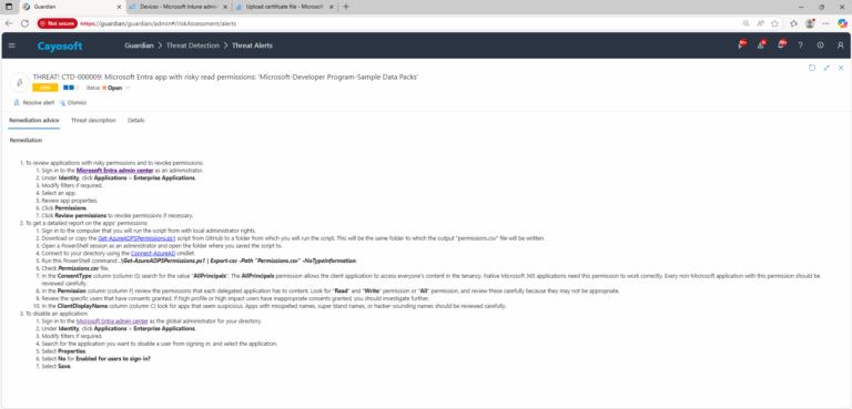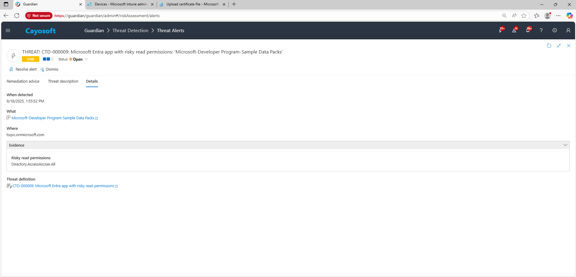 - Use Cayosoft Guardian to proactively detect and alert on Microsoft Entra app with risky read permissions across Entra ID, Microsoft 365, and Intune, providing early warning before attackers can exploit them.