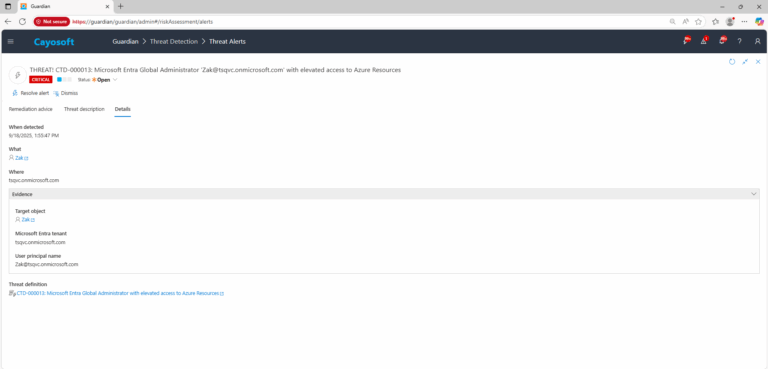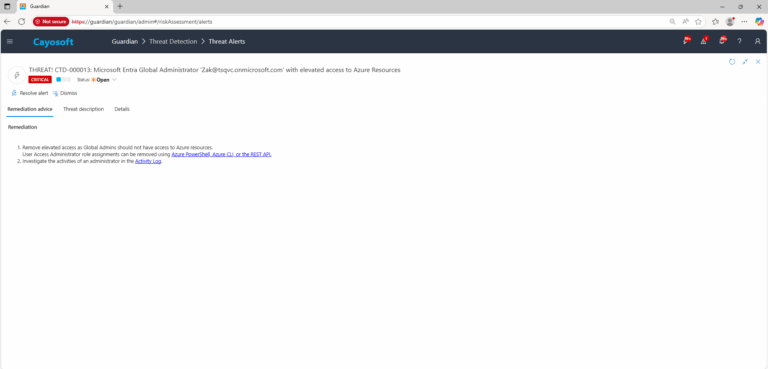 Cayosoft Guardian can proactively detect and alert on Global Administrators with elevated access to Azure resources. It continuously monitors Active Directory, Entra ID, Microsoft 365, and Intune for over 200 misconfigurations, providing early warning before attackers can exploit them.