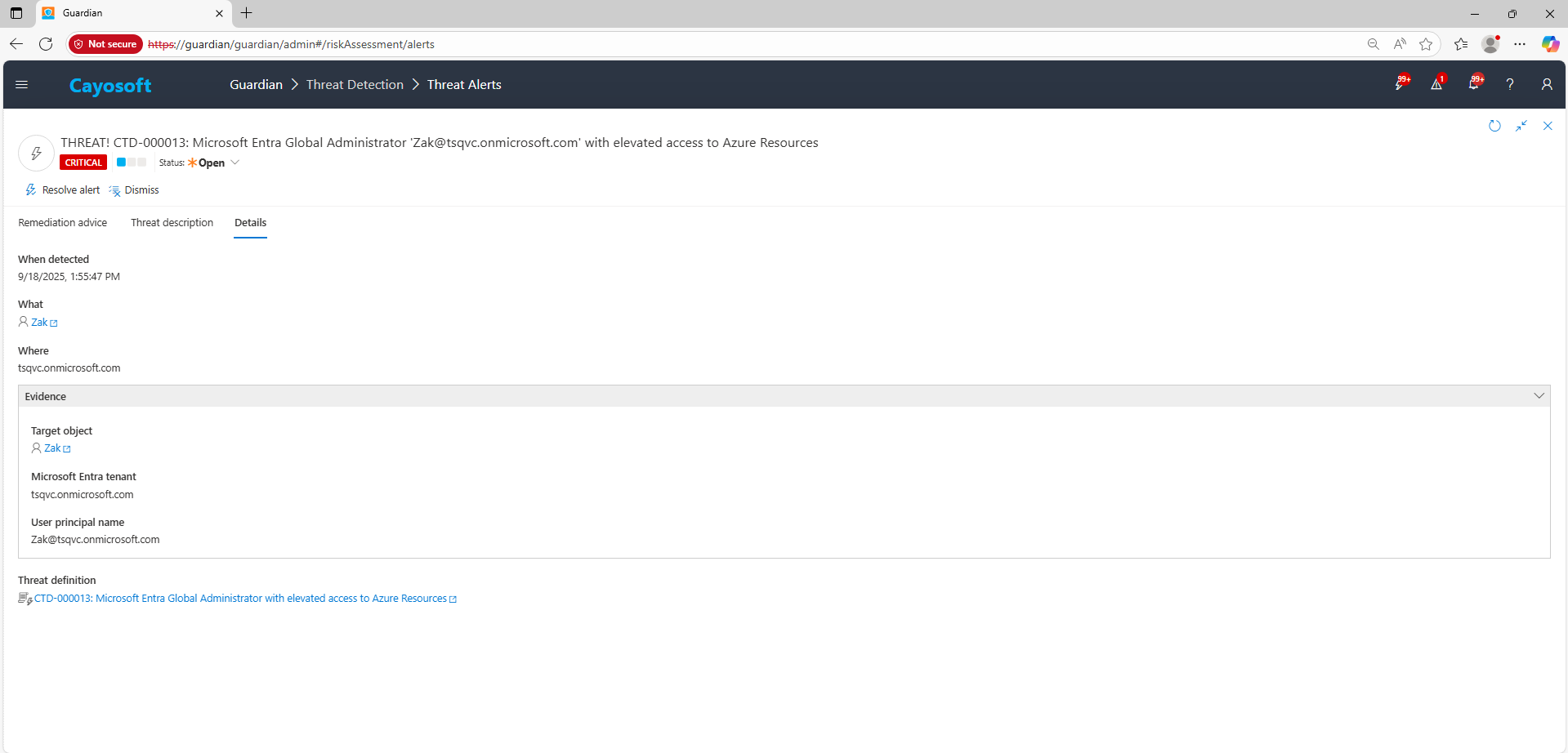 2.) Open All Alerts and search for CTD-000013 or Microsoft Entra Global Administrator with elevated access to Azure Resources.