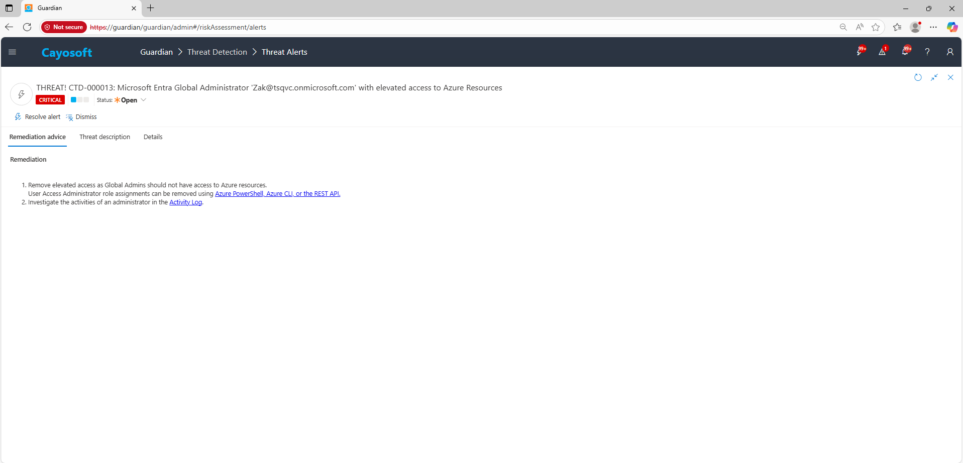 Cayosoft Guardian can proactively detect and alert on Global Administrators with elevated access to Azure resources. It continuously monitors Active Directory, Entra ID, Microsoft 365, and Intune for over 200 misconfigurations, providing early warning before attackers can exploit them.