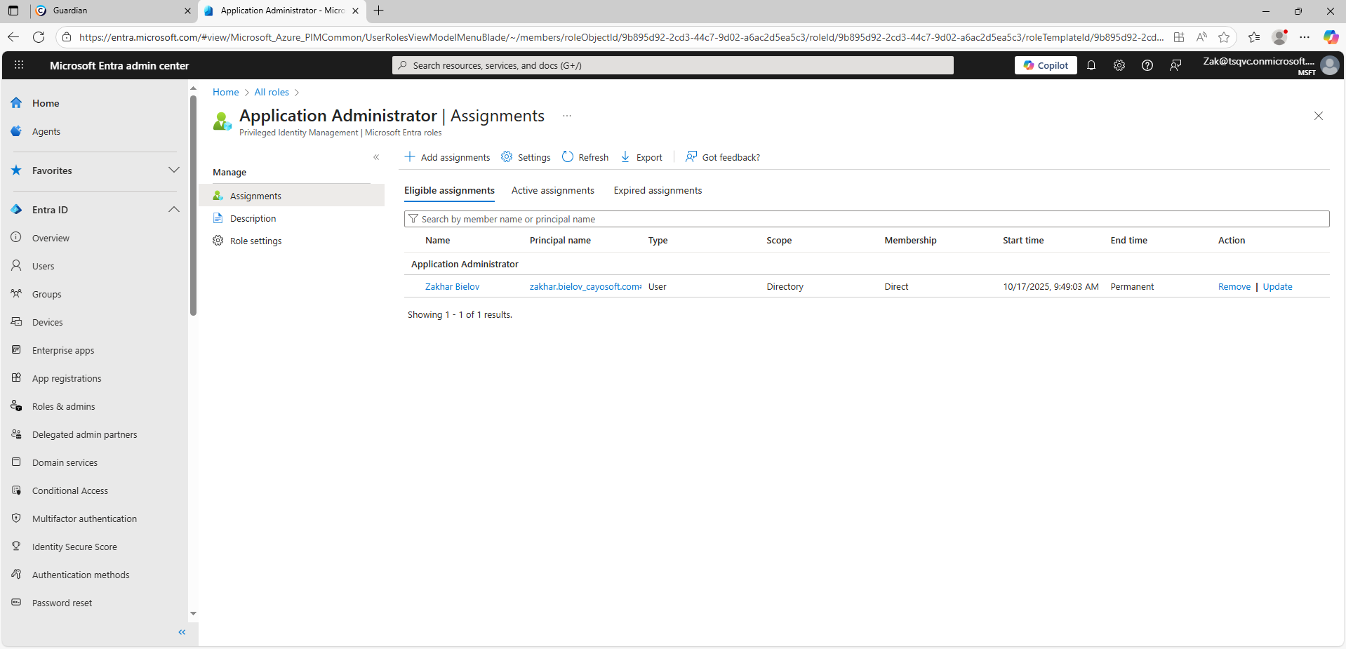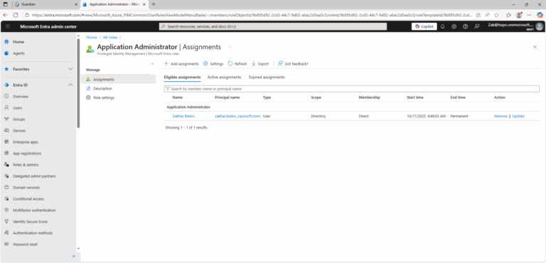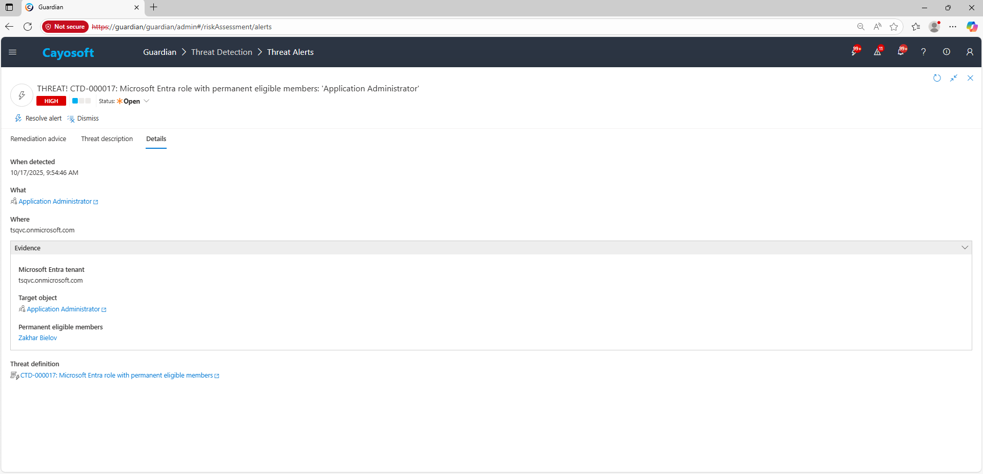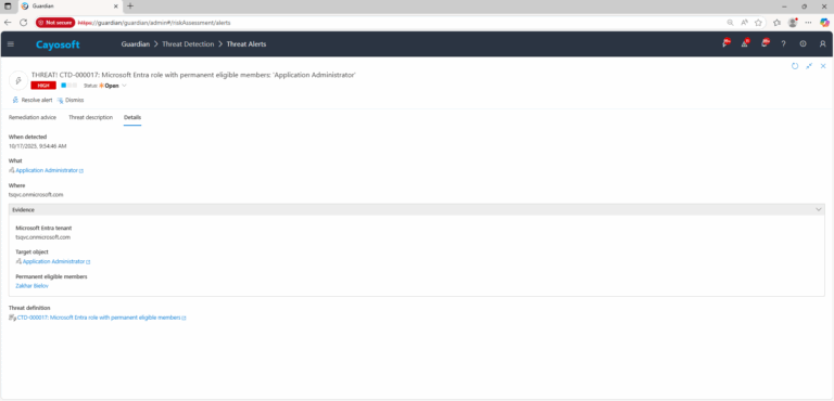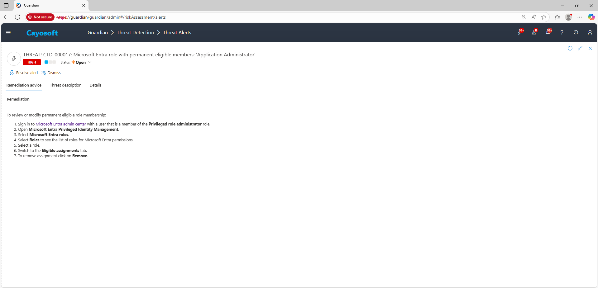 A contractor was granted permanent eligible membership for the Privileged Role Administrator role “for convenience.” After a phishing campaign, the attacker signs in as the contractor and uses weak MFA prompts to succeed. Because the membership is permanently eligible, the attacker can self-activate administrator permissions at any time without waiting for a new assignment to be created. They perform short, surgical changes (e.g., add a backdoor app registration) and then deactivate to blend in with normal activity. Cayosoft Guardian detects the exposure by flagging the presence of permanent eligible members on sensitive Entra roles so the team can remove or time-bound them before abuse.