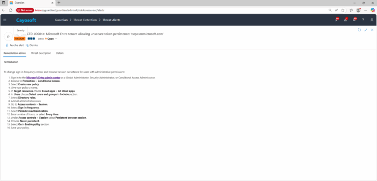 2.) View All Alerts and search for CTD-000041 or Microsoft Entra tenant allowing unsecure token persistence.