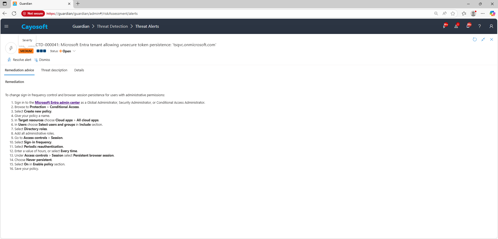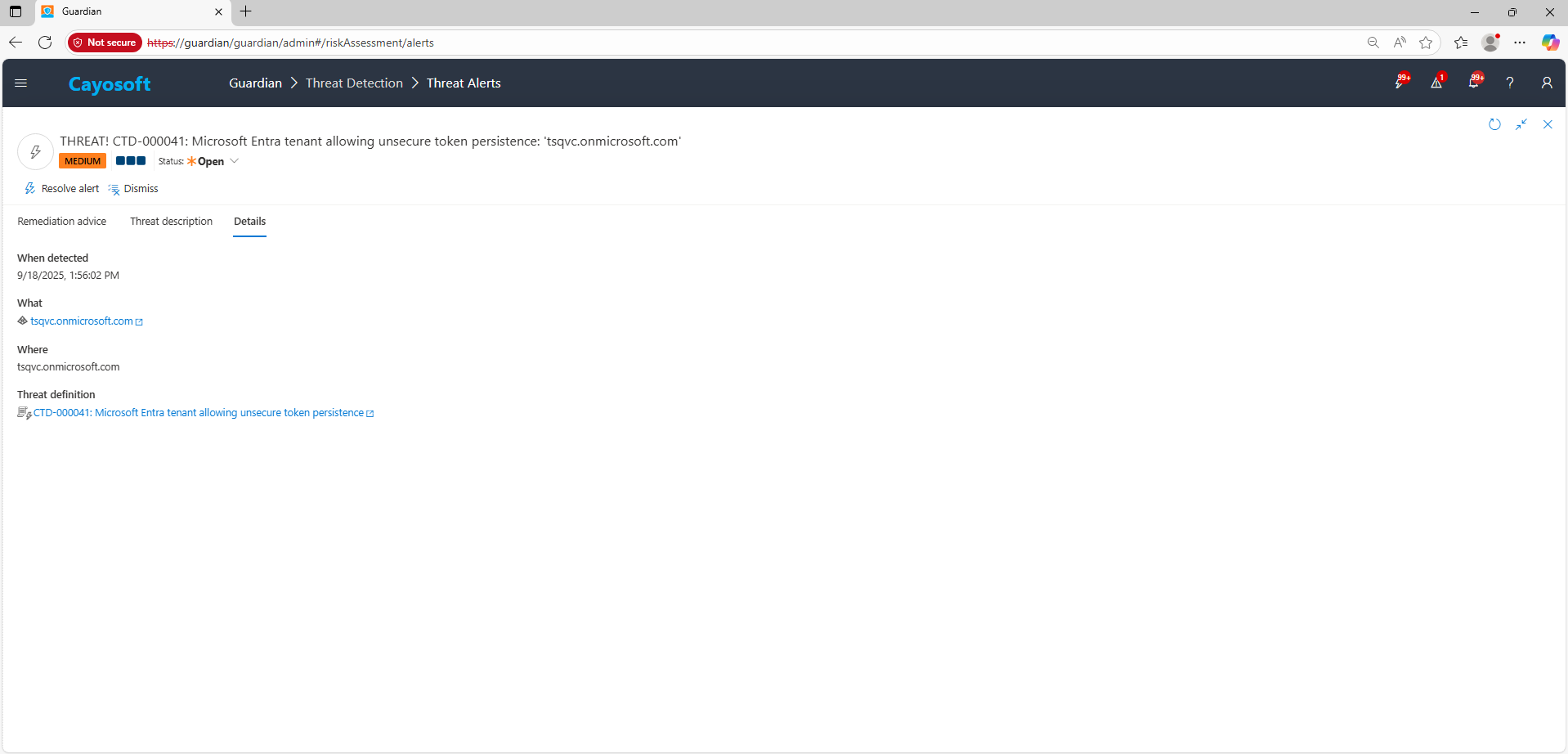 2.) View All Alerts and search for CTD-000041 or Microsoft Entra tenant allowing unsecure token persistence.