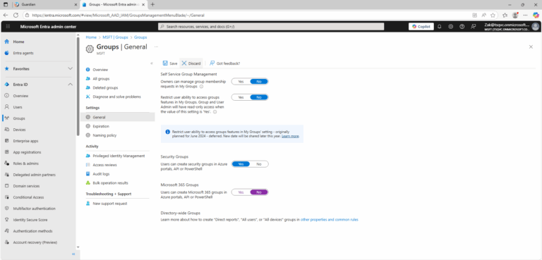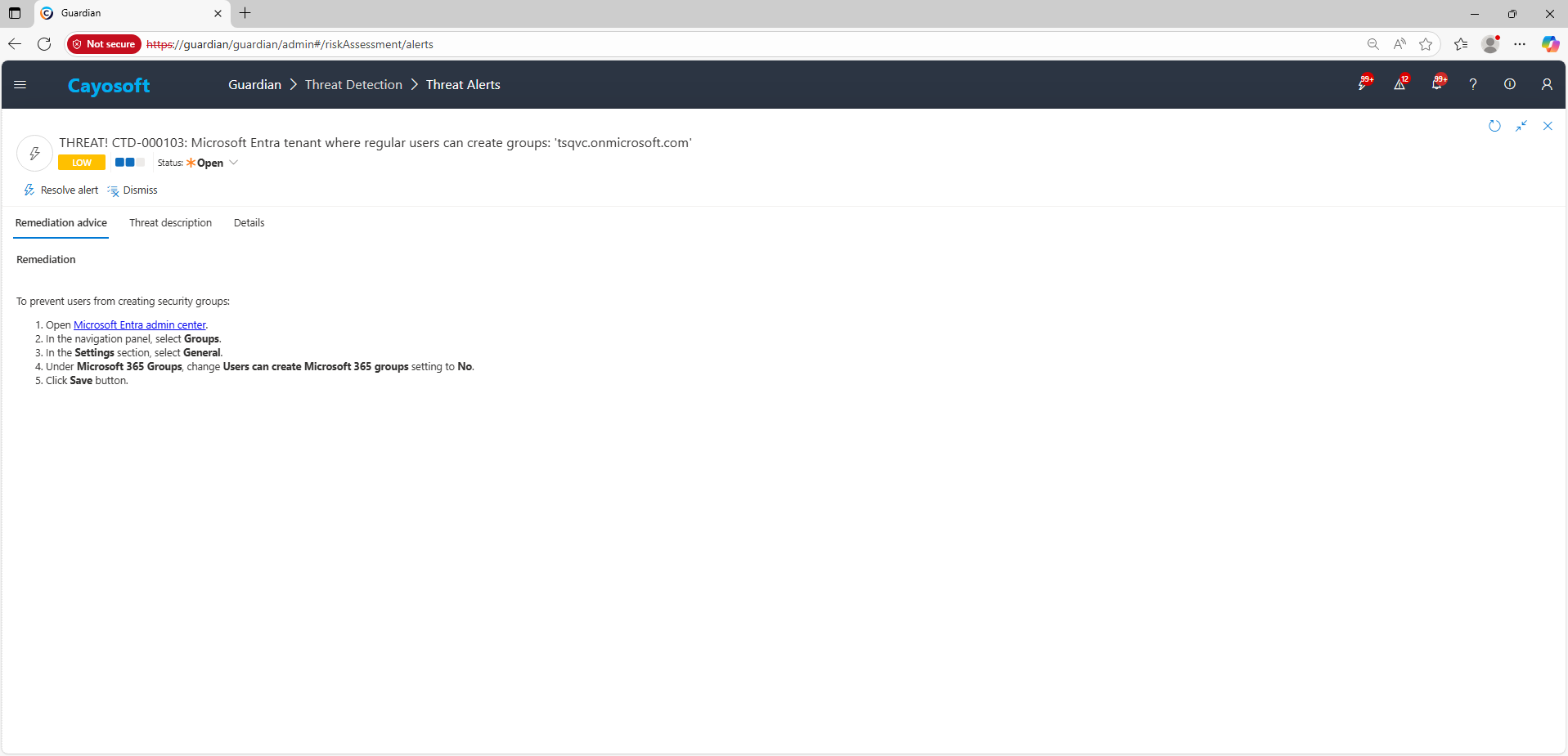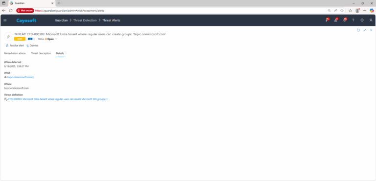 Cayosoft Guardian can proactively detect and alert on Microsoft Entra tenant where regular users can create Microsoft 365 groups. It continuously monitors Active Directory, Entra ID, Microsoft 365, and Intune for over 200 misconfigurations, providing early warning before attackers can exploit them.