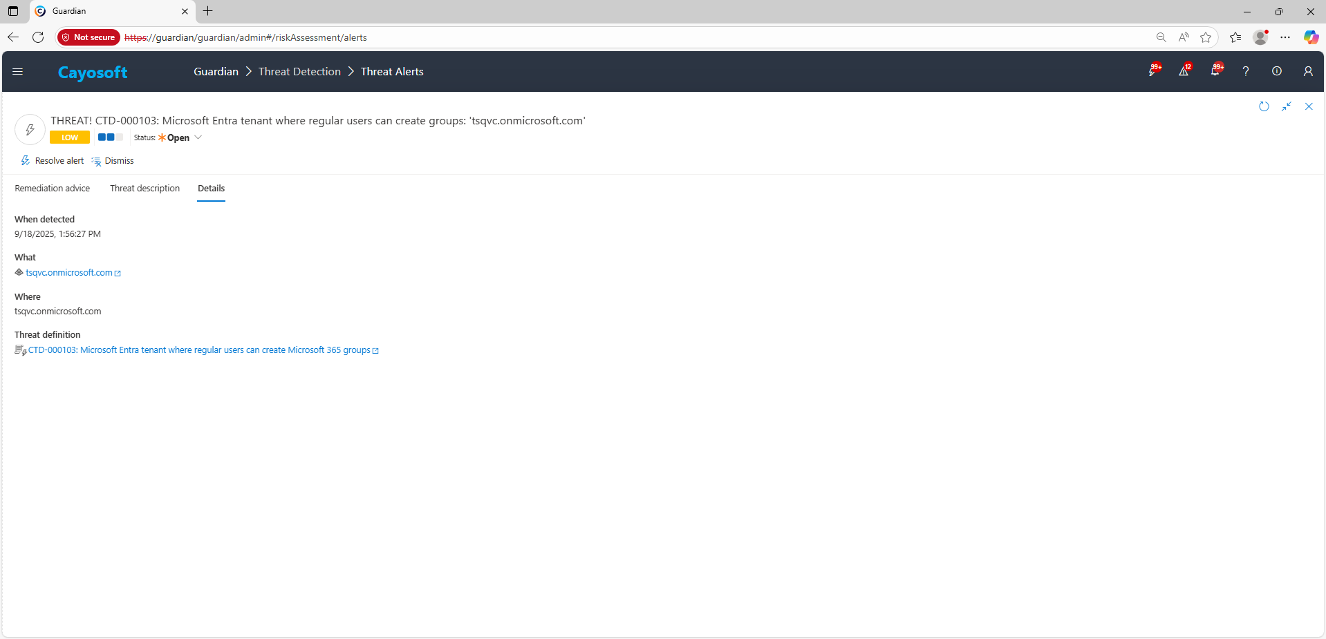 2.) Open All Alerts and search for CTD-000103 or Microsoft Entra tenant where regular users can create Microsoft 365 groups.
