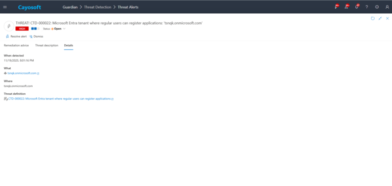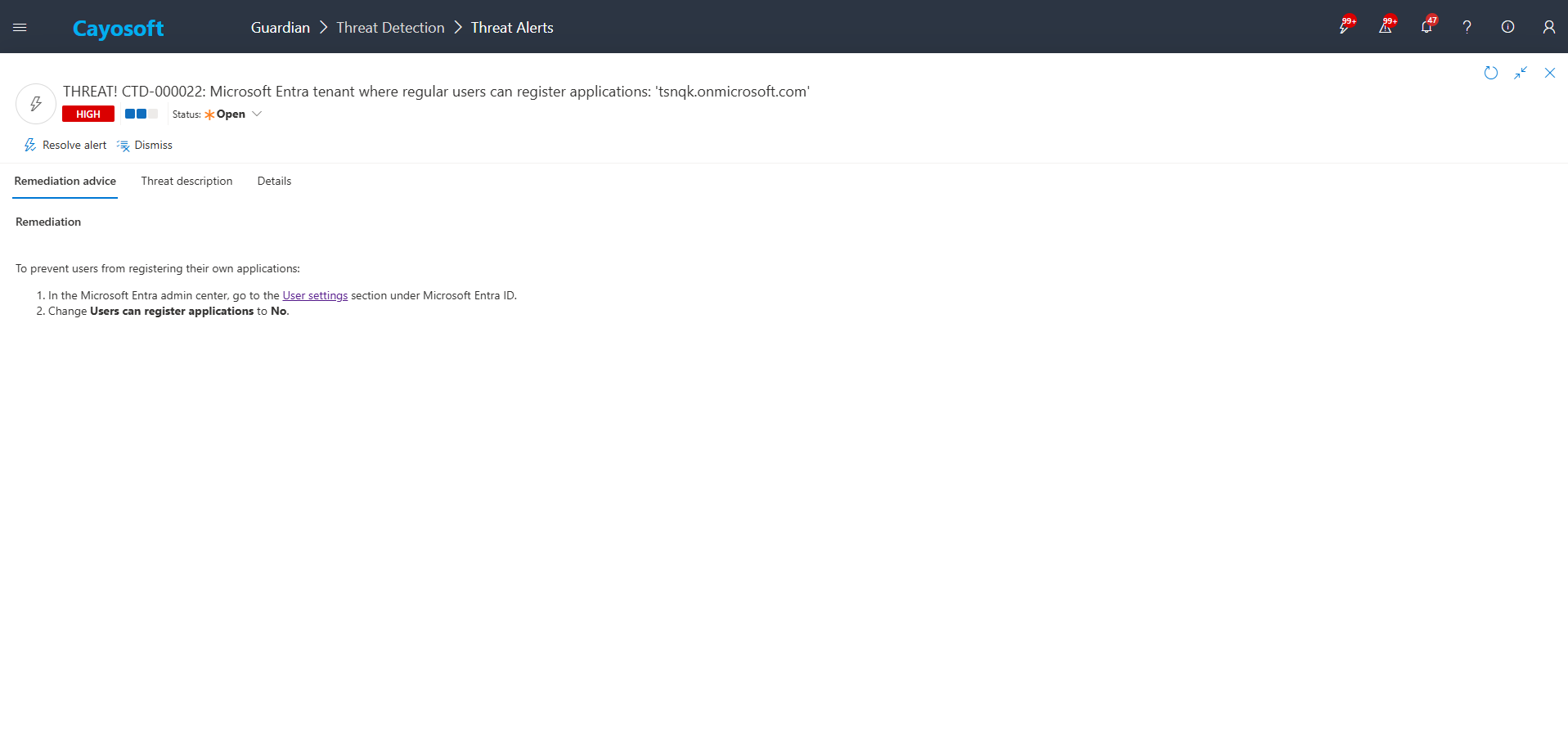 Cayosoft Guardian continuously evaluates tenant-wide Entra ID configuration and raises CTD-000022 when the “Users can register applications” setting is enabled.