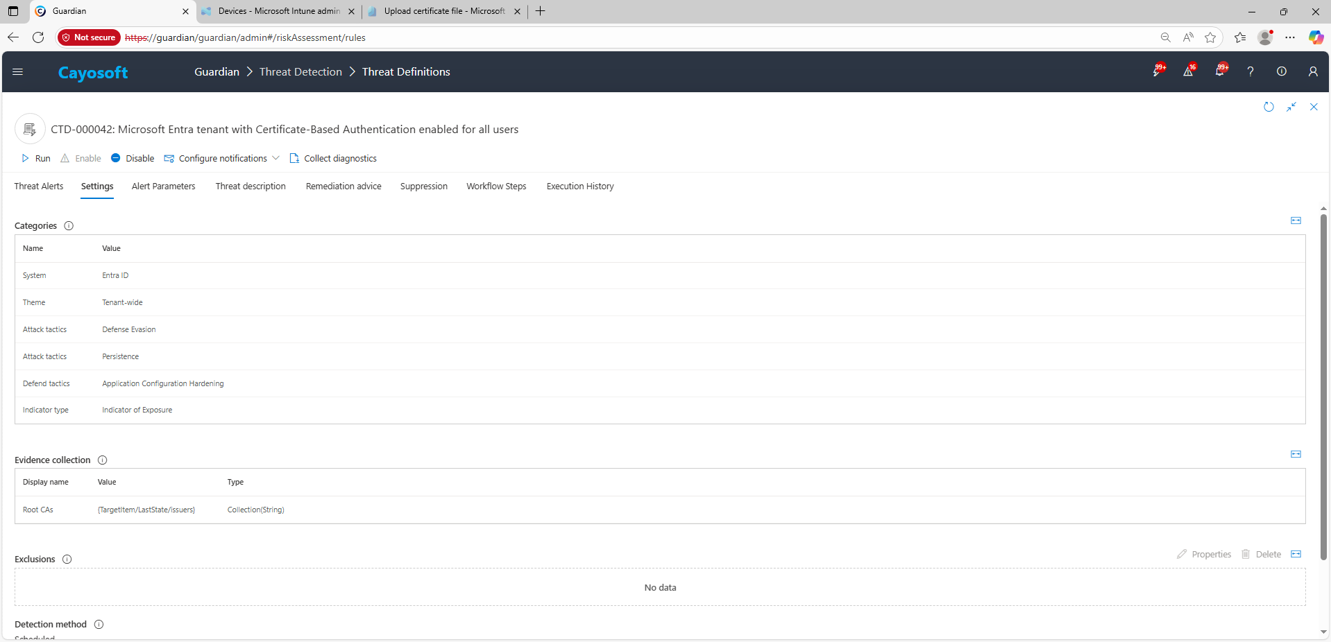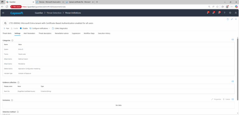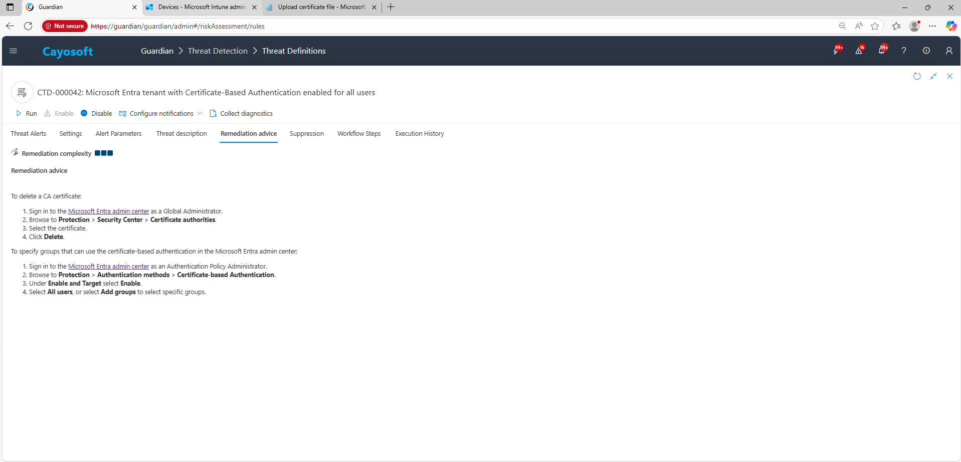 Cayosoft Guardian can proactively detect and alert on Microsoft Entra tenant with Certificate-Based Authentication enabled for all users. It continuously monitors Active Directory, Entra ID, Microsoft 365, and Intune for over 200 misconfigurations, providing early warning before attackers can exploit them.