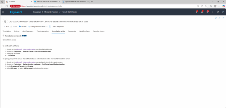 Cayosoft Guardian continuously monitors Entra ID for risky configurations, including tenant-wide CBA and untrusted or excessive certificate authorities. It generates alerts, provides evidence of the trusted CAs, and gives prescriptive remediation steps to safely scope or remove hazardous CBA settings.