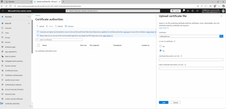 When Certificate-Based Authentication (CBA) is enabled for every user in the tenant, any compromise of a trusted Certificate Authority (CA) can allow attackers to impersonate users silently. A forged certificate from a compromised or misused CA can bypass passwords and MFA, enabling long-term persistence and stealthy access across the tenant.