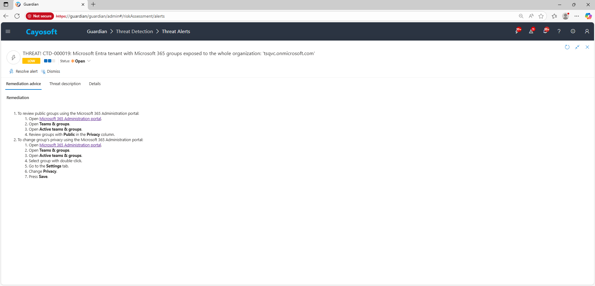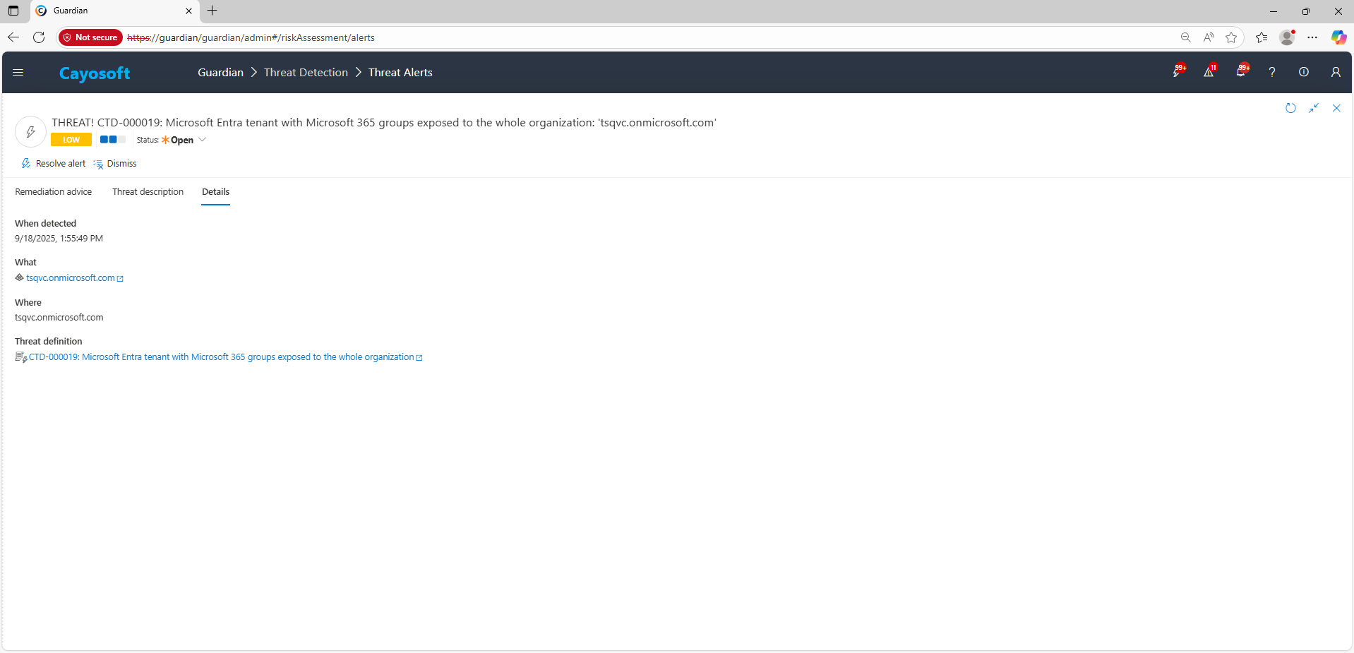 2.) View All Alerts and search for CTD-000019 or Microsoft Entra tenant with Microsoft 365 groups exposed to the whole organization.