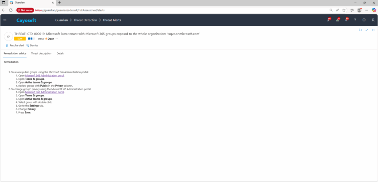 Proactive monitoring and timely remediation of configuration risks is essential to maintaining a secure Active Directory and Microsoft 365 environment. By addressing issues like Microsoft Entra tenant with Microsoft 365 groups exposed to the whole organization, you reduce attack surfaces and strengthen your organization’s overall security posture.