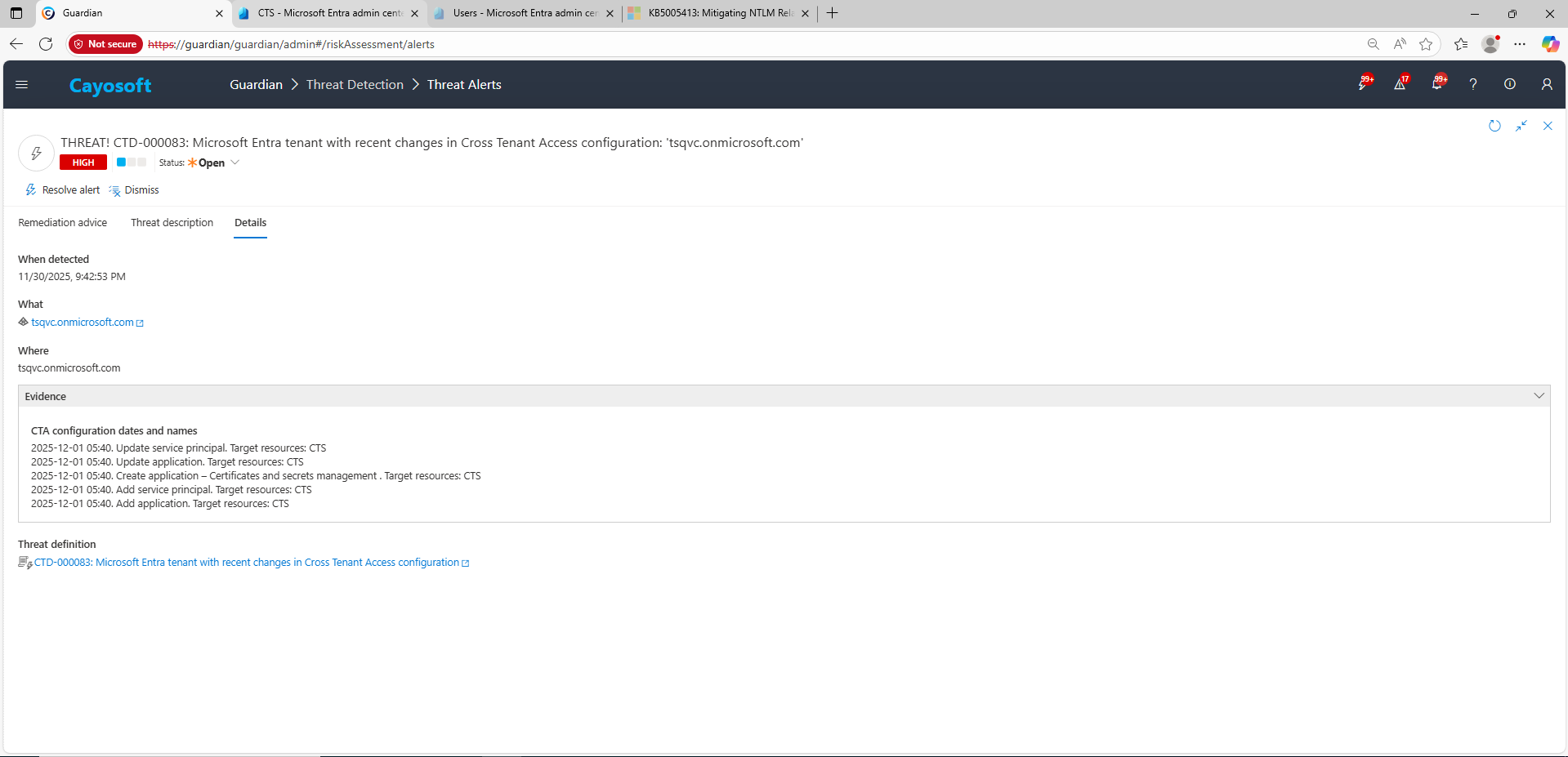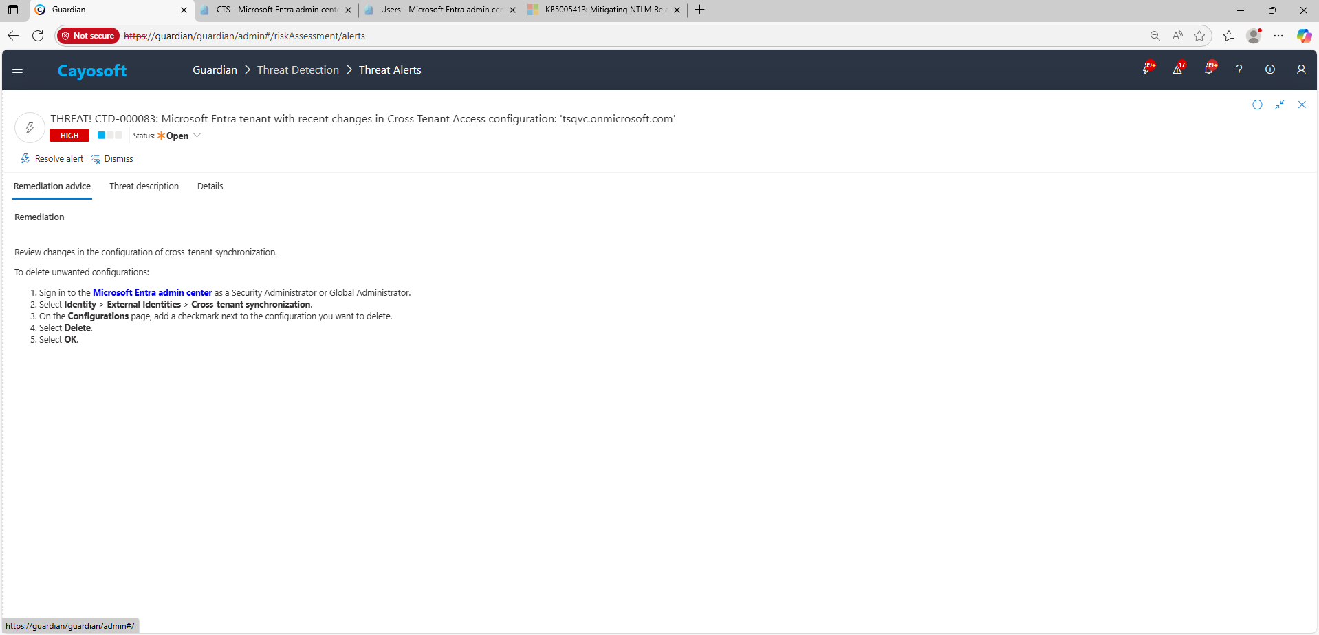 • Cayosoft Guardian can proactively detect and alert on Microsoft Entra tenant with recent changes in Cross Tenant Access configuration. It continuously monitors Active Directory, Entra ID, Microsoft 365, and Intune for 200+ misconfigurations, providing early warning before attackers can exploit them.
