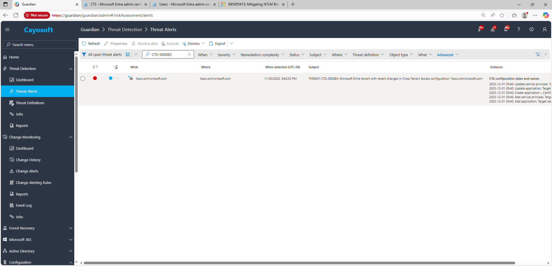 Yes. Cayosoft Guardian provides continuous monitoring, alerting, configuration auditing, and prescriptive remediation for CTA-related risks and 200+ other AD/M365 misconfigurations.