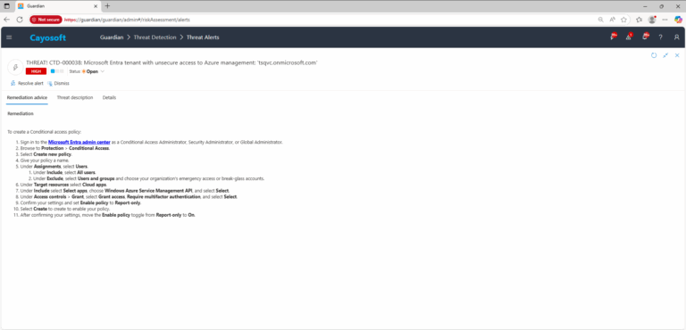 Cayosoft Guardian can proactively detect and alert on unsecure access to Azure management. It continuously monitors Active Directory, Entra ID, Microsoft 365, and Intune for over 200 misconfigurations, providing early warning before attackers can exploit them.