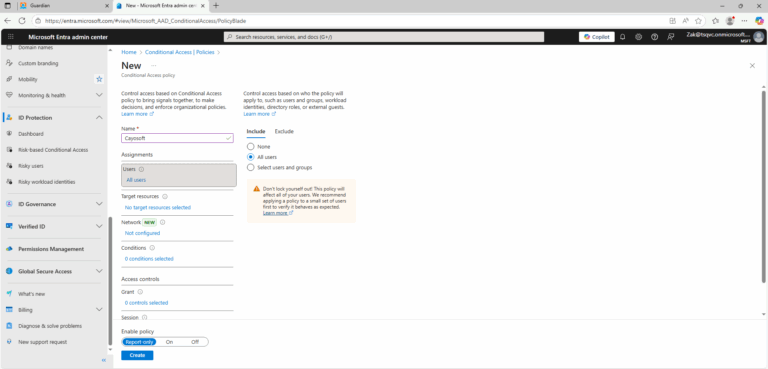 Create a new Conditional Access policy, include all users, and exclude only emergency (break-glass) accounts. Start in Report-only mode, validate sign-in results, remediate exceptions, then switch the policy to On.