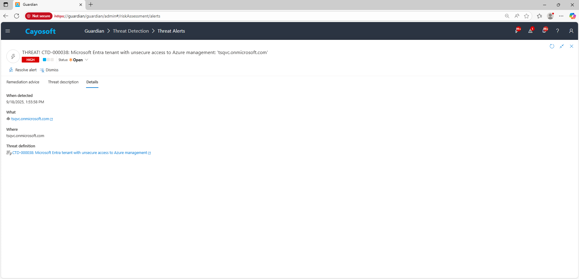 2.) Open All Alerts and search for CTD-000038 or Microsoft Entra tenant with unsecure access to Azure management.