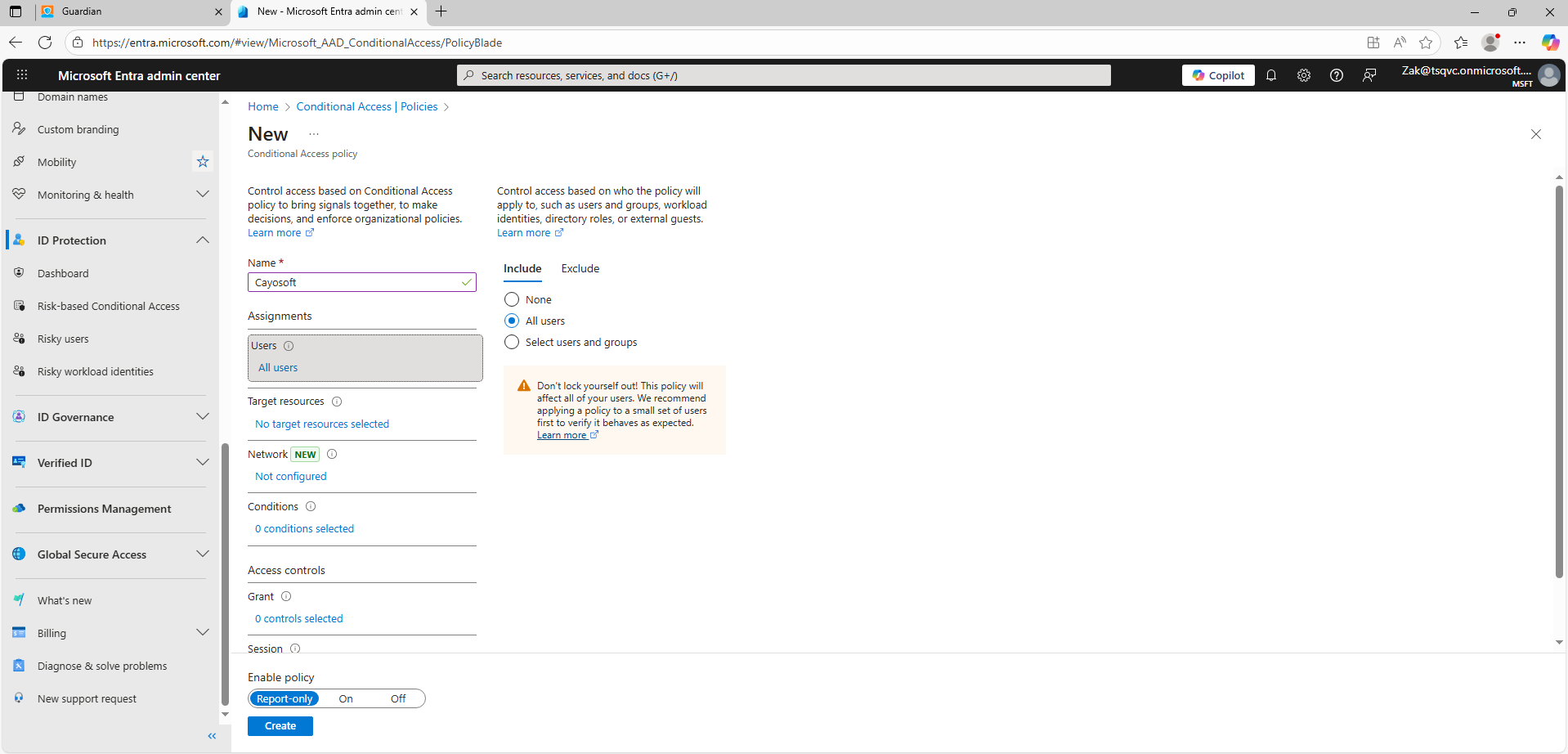 9. ) Confirm your settings and set Enable policy to Report-only.