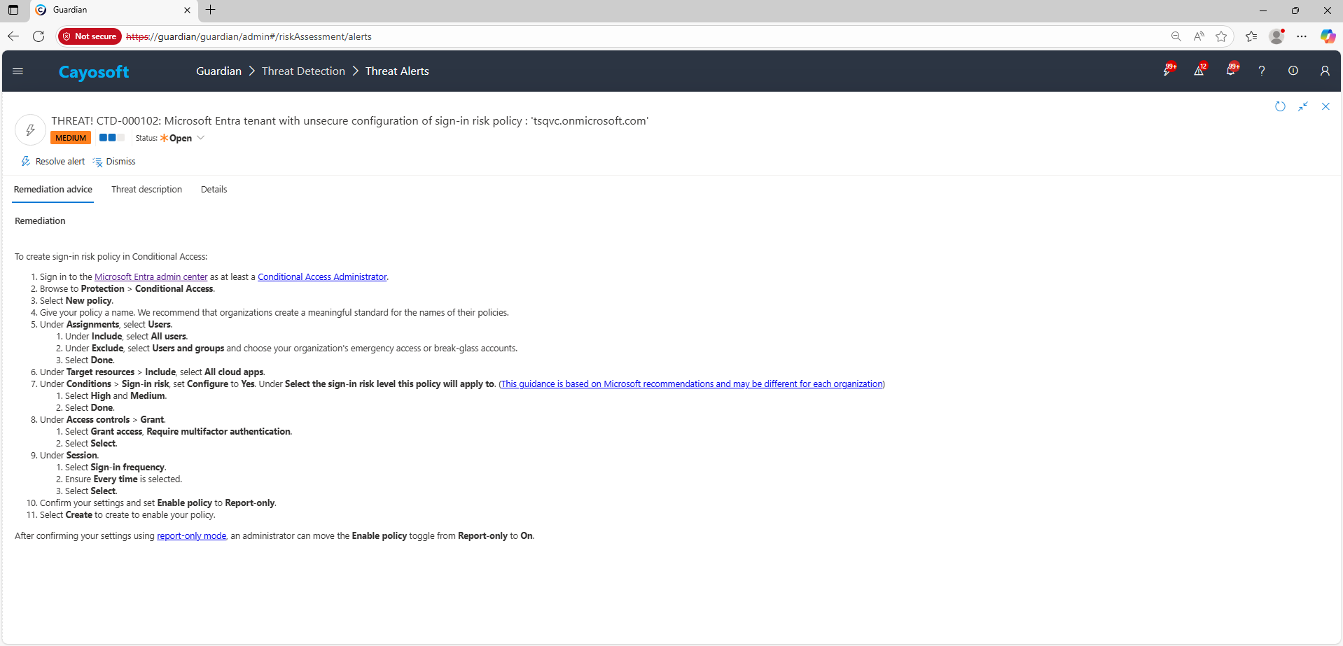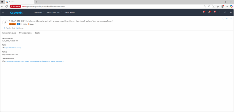 Cayosoft Guardian can proactively detect and alert on Microsoft Entra tenant with unsecure configuration of sign-in risk policy. It continuously monitors Active Directory, Entra ID, Microsoft 365, and Intune for over 200 misconfigurations, providing early warning before attackers can exploit them.