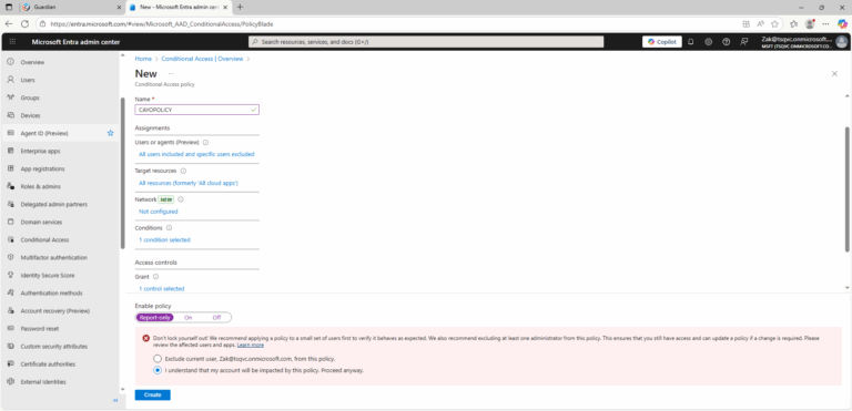 10. ) Confirm your settings and set Enable policy to Report-only.