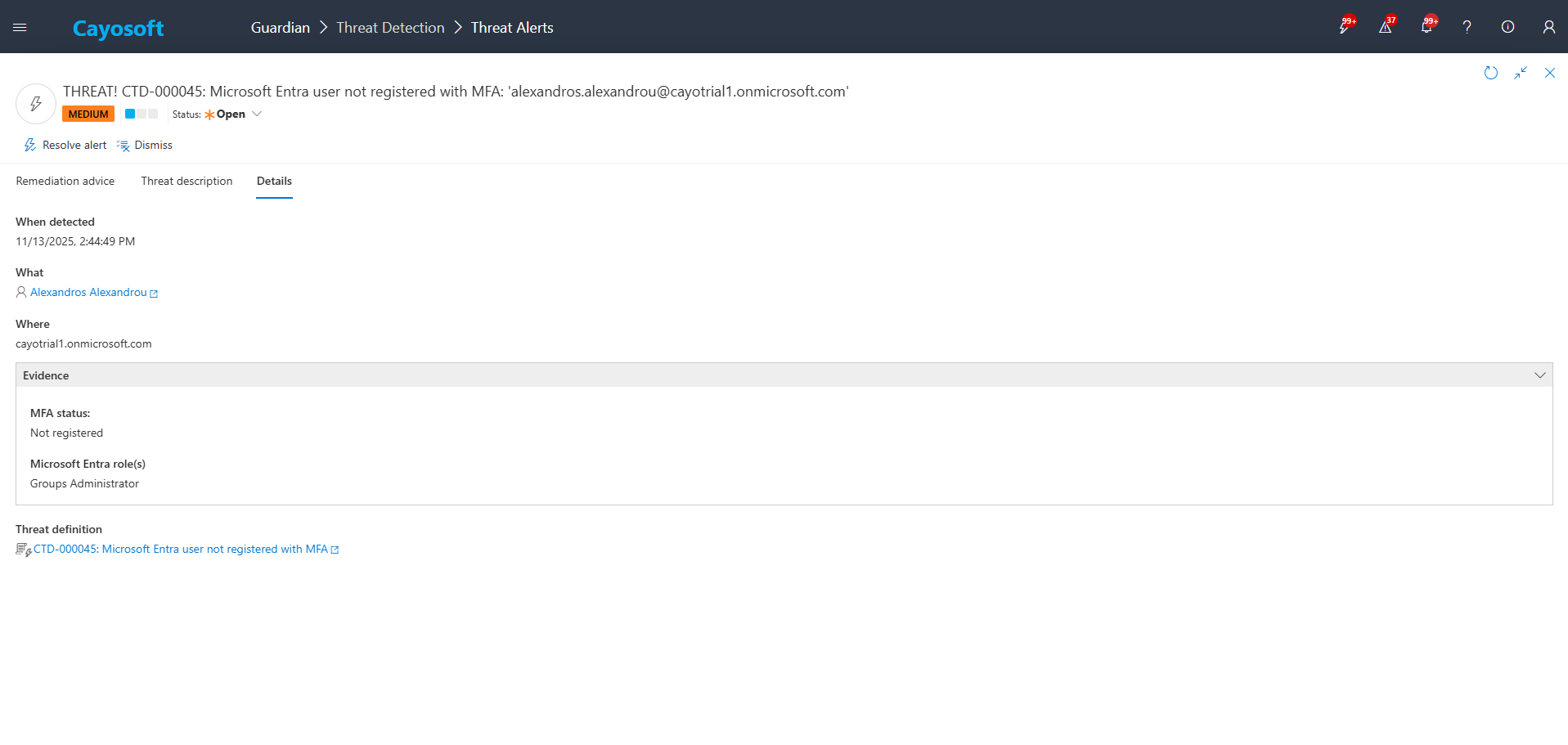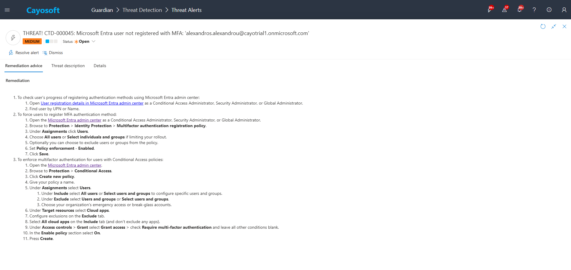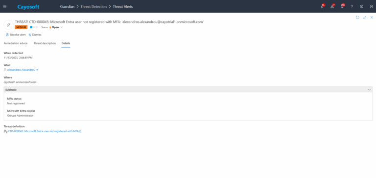 Cayosoft Guardian can proactively detect and alert on Microsoft Entra user not registered with MFA. It continuously monitors Active Directory, Entra ID, Microsoft 365, and Intune for over 200 misconfigurations, providing early warning before attackers can exploit them.