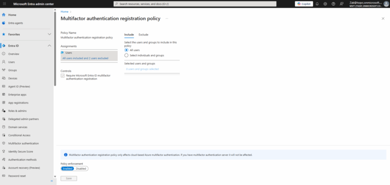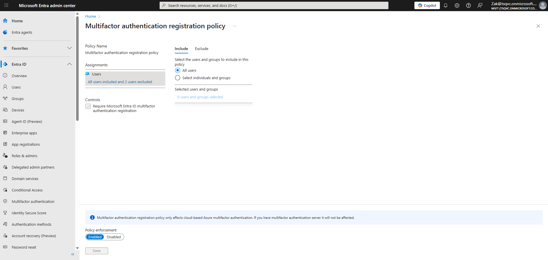 - ) Browse to Protection > Identity Protection > Multifactor authentication registration policy.