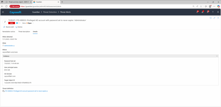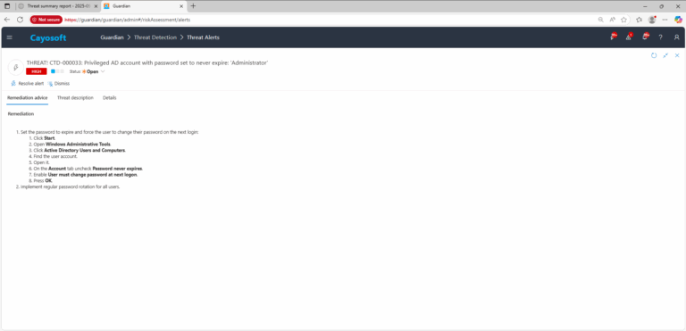 • Cayosoft Guardian can proactively detect and alert on Privileged AD account password set to never expire. It continuously monitors Active Directory, Entra ID, Microsoft 365, and Intune for over 200 misconfigurations, providing early warning before attackers can exploit them.