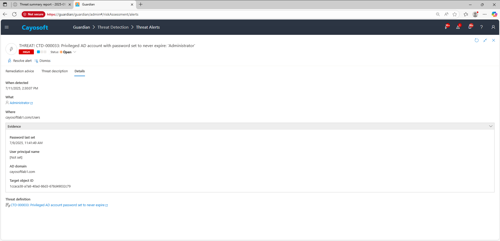 • Cayosoft Guardian can proactively detect and alert on Privileged AD account password set to never expire. It continuously monitors Active Directory, Entra ID, Microsoft 365, and Intune for over 200 misconfigurations, providing early warning before attackers can exploit them.