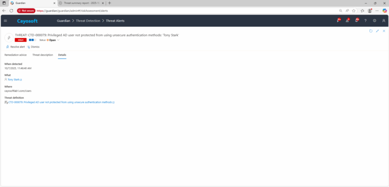 Cayosoft Guardian can proactively detect and alert on Privileged AD user not protected from using unsecure authentication methods. It continuously monitors Active Directory, Entra ID, Microsoft 365, and Intune for over 200 misconfigurations, providing early warning before attackers can exploit them.
