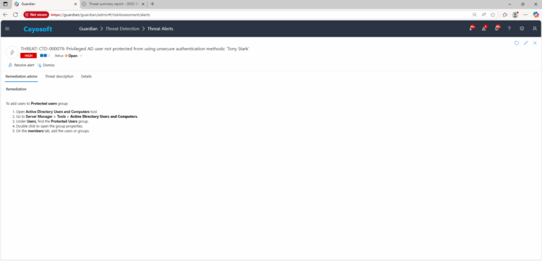 In the Cayosoft Guardian Threat Detection Dashboard, search for CTD-000079 or the issue name. The alert identifies privileged users (with adminCount=1) who are not members of the Protected Users group, helping administrators quickly locate accounts that remain exposed to insecure authentication mechanisms.
