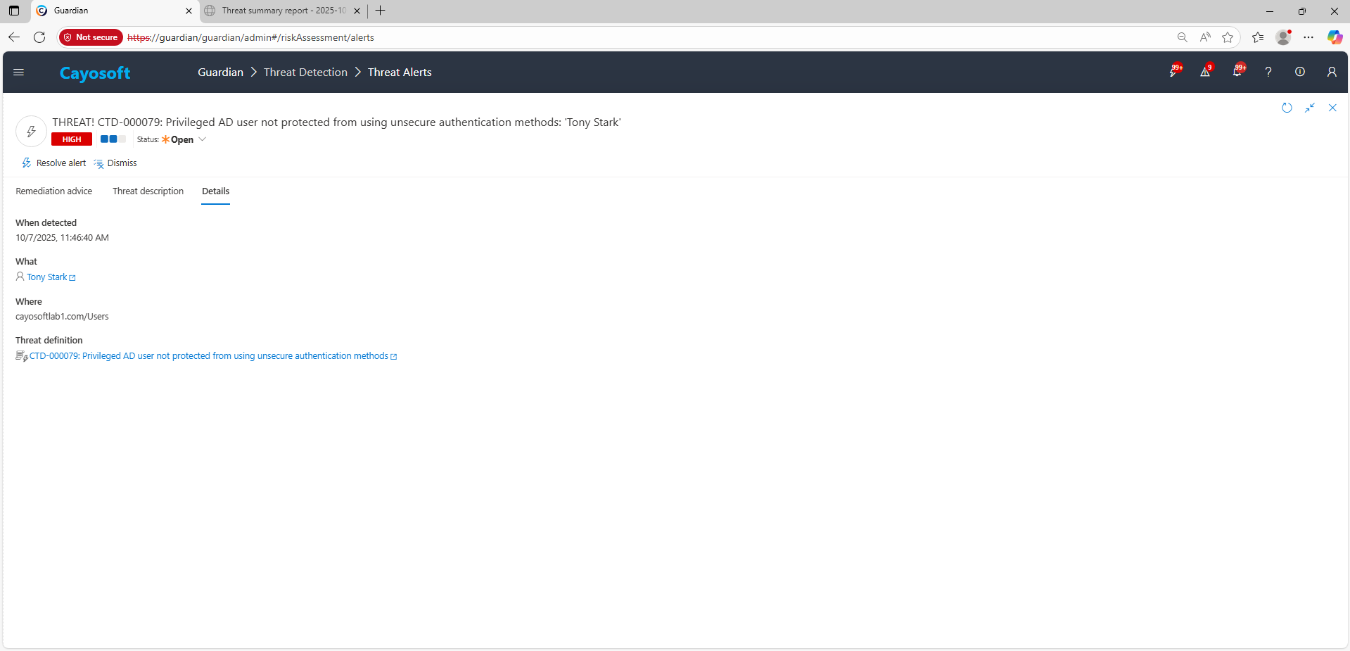 Cayosoft Guardian can proactively detect and alert on Privileged AD user not protected from using unsecure authentication methods. It continuously monitors Active Directory, Entra ID, Microsoft 365, and Intune for over 200 misconfigurations, providing early warning before attackers can exploit them.