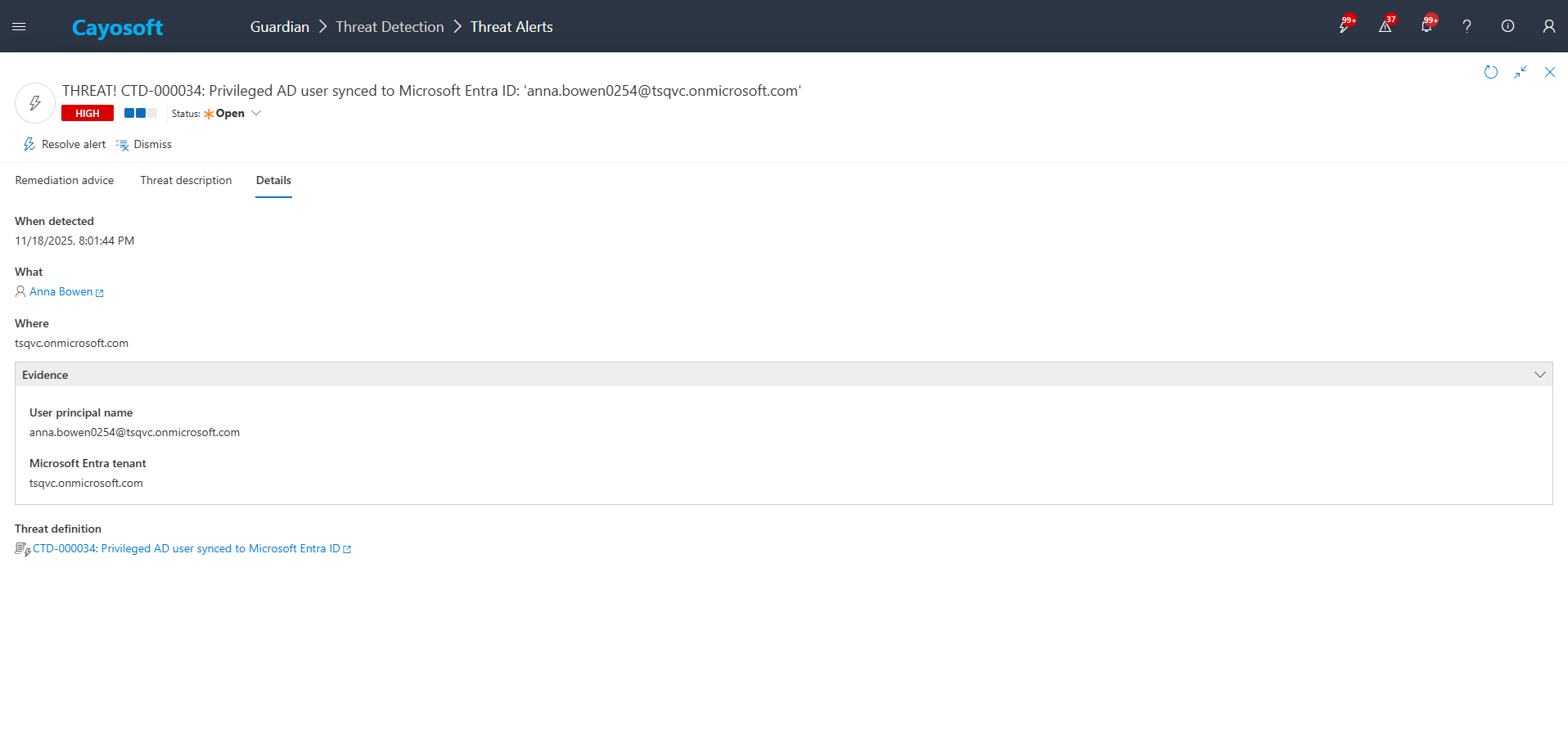 2.) View All Alerts and search for CTD-000034 or Privileged AD user synced to Microsoft Entra ID.