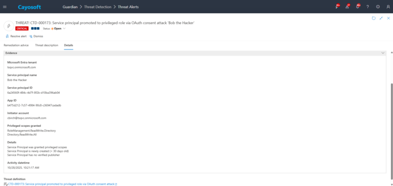 An attacker compromises a standard user account in Microsoft 365 that can grant consent to applications. The attacker tricks the user into approving a malicious multi-tenant app that requests powerful Graph scopes such as Directory.ReadWrite.All or Application.ReadWrite.All. Entra ID creates a service principal in the tenant and stores the granted privileged scopes, effectively promoting the service principal to a highly privileged role without adding the attacker to any obvious admin group. The attacker then uses the app’s credentials or refresh tokens to manage users, groups, and applications in the background, maintaining persistence even if the original user changes their password. Because the app has no owners and no verified publisher, the risk is easy to miss in the portal. Cayosoft Guardian, using CTD-000173, detects that a service principal was promoted to privileged access via OAuth consent and raises an alert within the 25-hour lookback window so the security team can revoke access quickly.