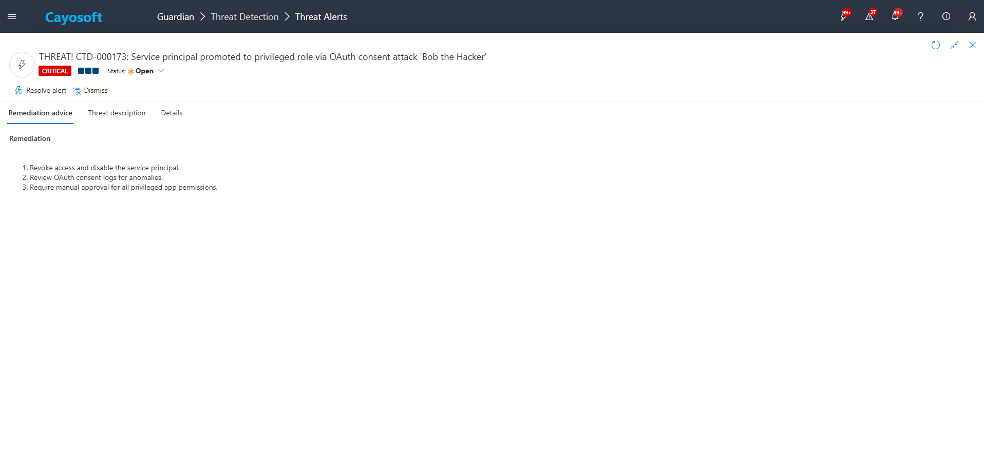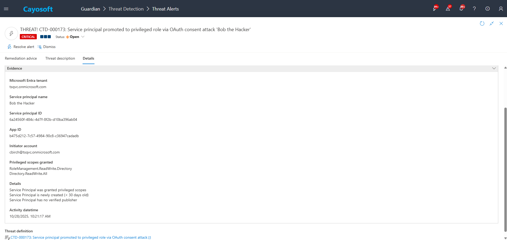 2.) View All Alerts and search for “CTD-000173” or “Service principal promoted to privileged role via OAuth consent attack”.