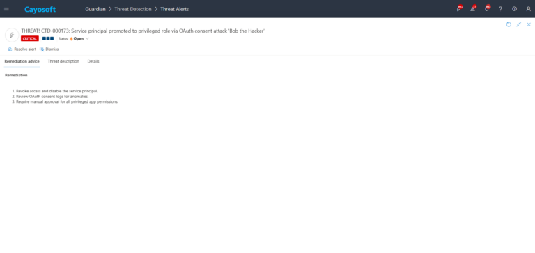 Cayosoft Guardian can proactively detect and alert on Service principal promoted to privileged role via OAuth consent attack. It continuously monitors Active Directory, Entra ID, Microsoft 365, and Intune for configuration risks and misconfigurations, providing early warning before attackers can exploit them.