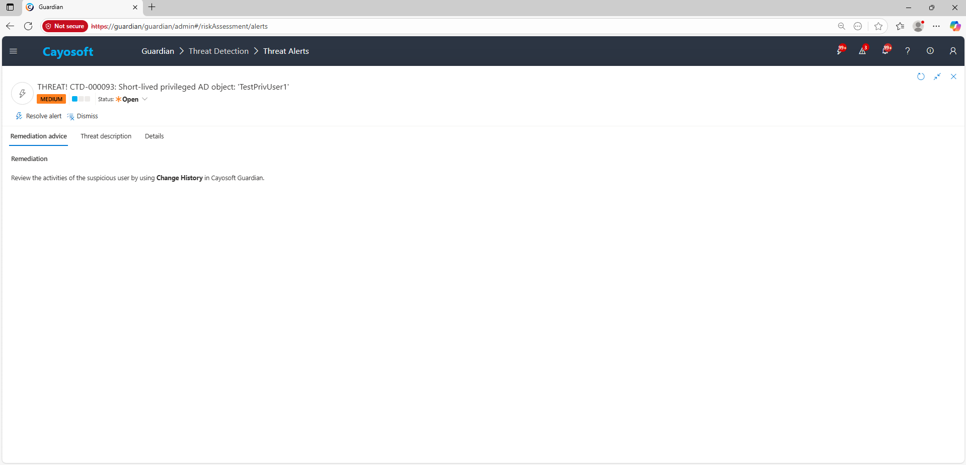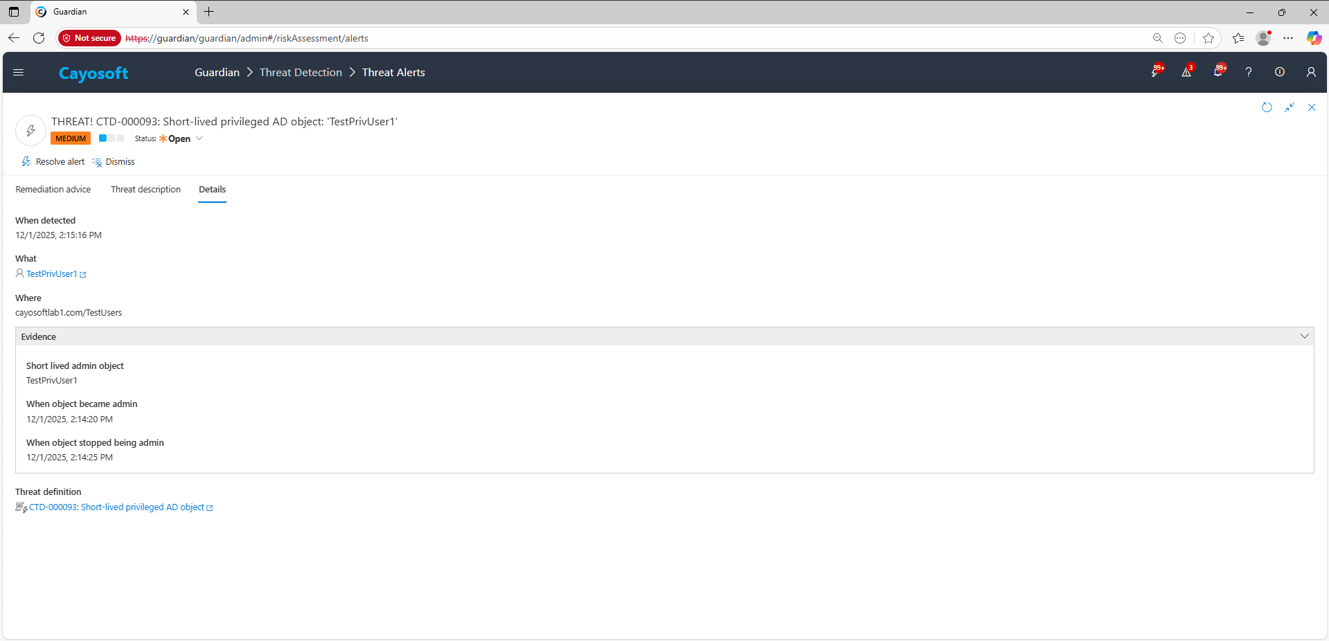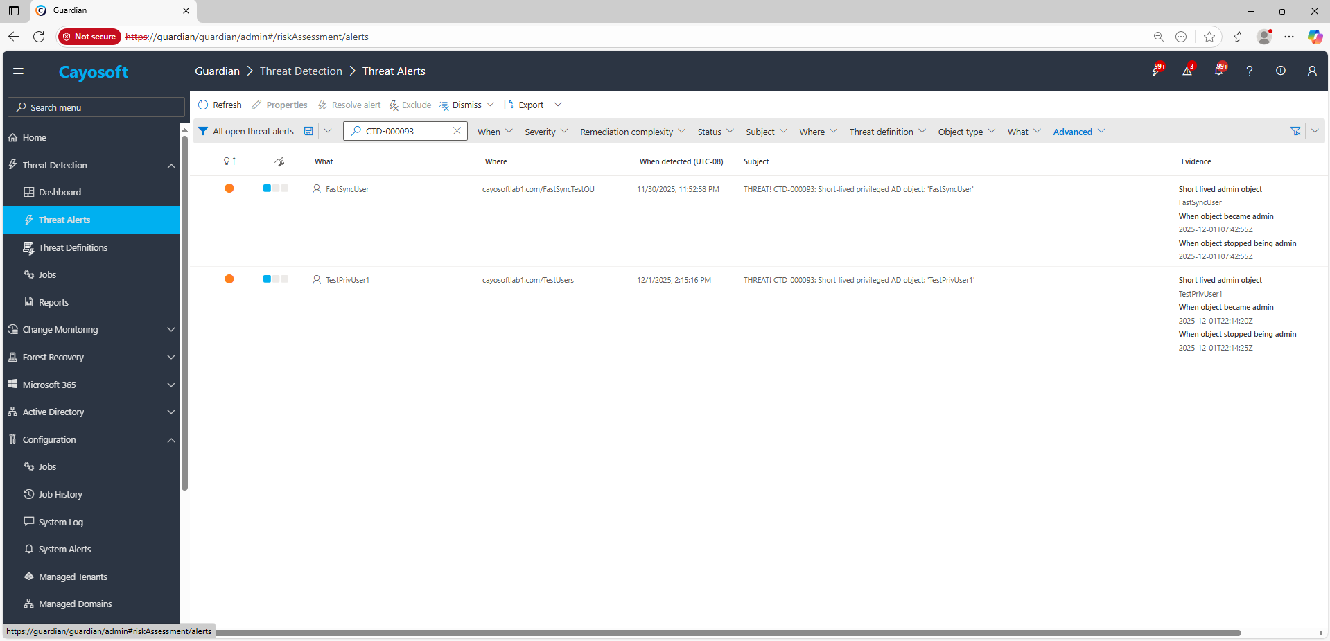 2.) Open All Alerts and search for CTD-000093 or Short-lived privileged AD object.